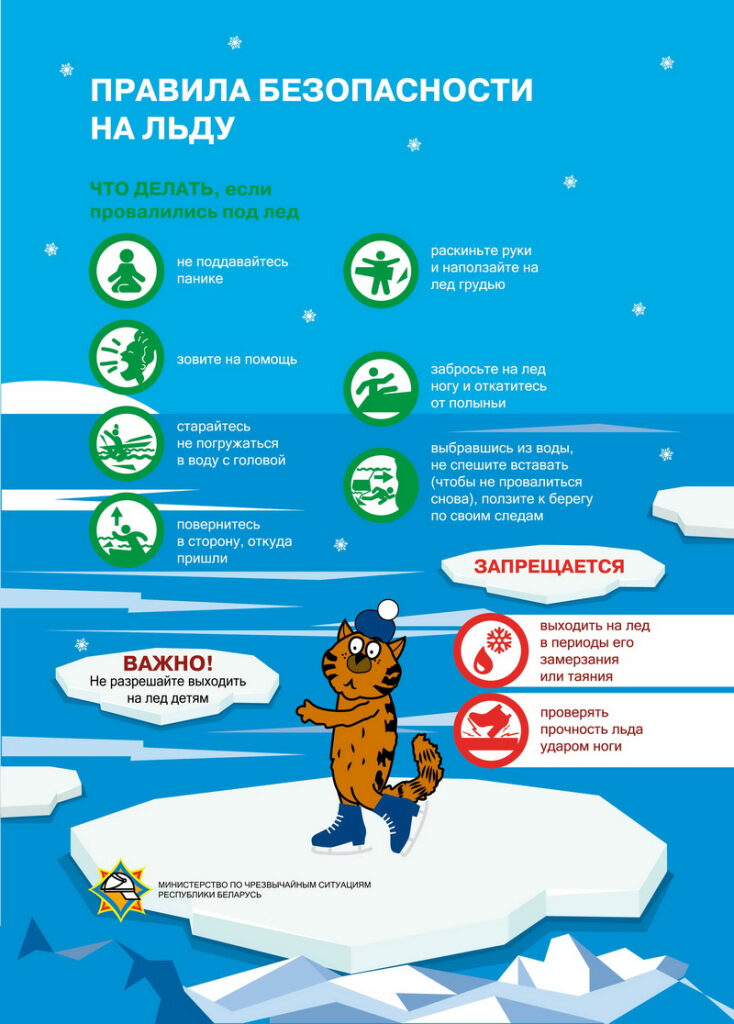 — старайтесь не обламывать кромку, без резких движений выбирайтесь на лед, заползая грудью и поочередно вытаскивая на поверхность ноги широко их расставив;