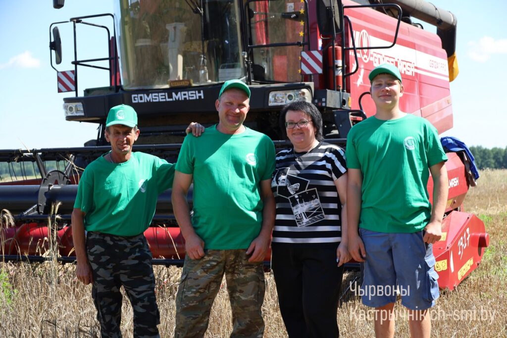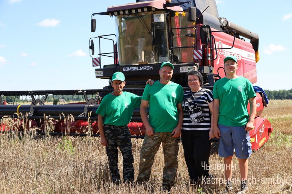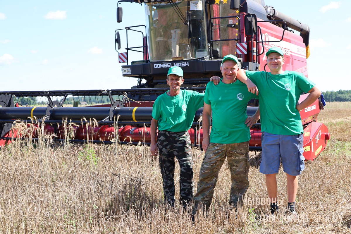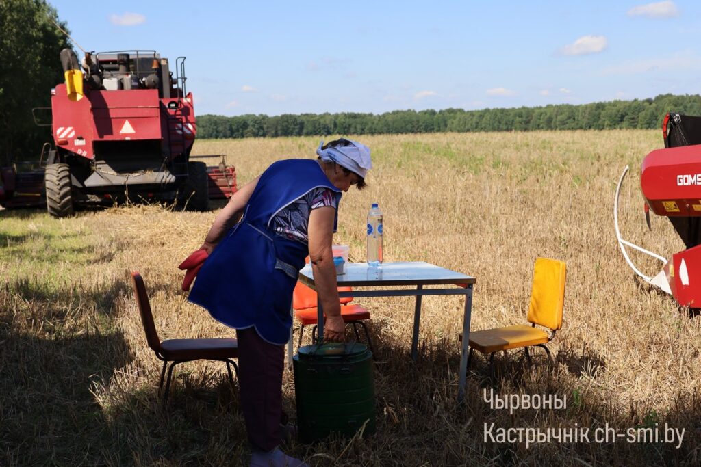Сразу два зерноуборочных комбайна здесь убирали озимые зерновые. На одном из них – опытный механизатор хозяйства Александр Дробов. На втором – семейный экипаж Цагельников в составе отца Александра и сына Андрея. Вместе с председателем Октябрьской районной профсоюзной организации Белорусского профсоюза работников агропромышленного комплекса Евой Дервоед приезжаем на поле как раз во время обеда.