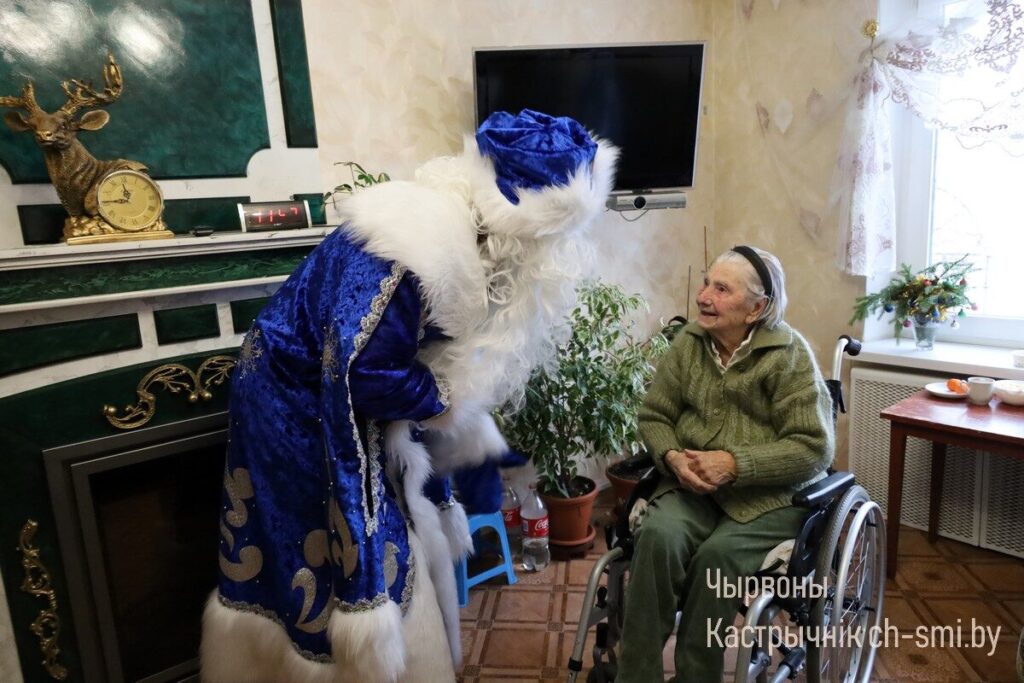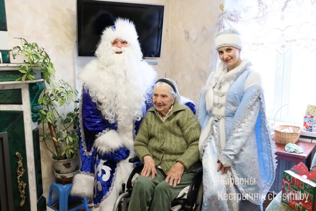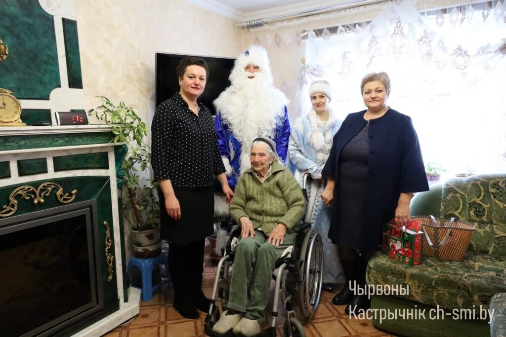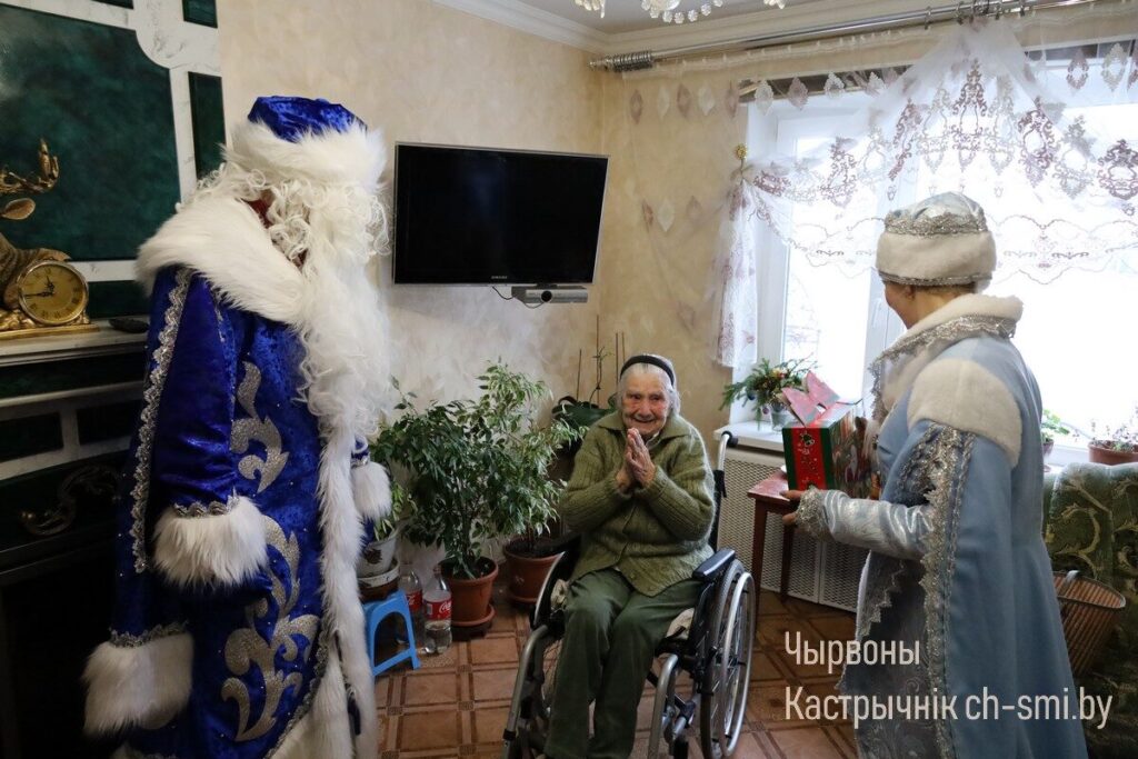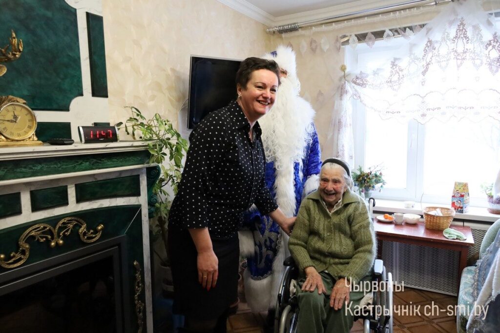 С большой радостью и благодарностью поздравления принимала участница Великой Отечественной войны Анна Алексеевна Петух. С акцией «От всей души», поздравлениями от Деда Мороза и Снегурочки и подарками ее навестили начальник управления по труду, занятости и социальной защите Октябрьского райисполкома Татьяна Габинетова и директор Октябрьского ТЦСОН Татьяна Катеринич. Они пожелали Анне Алексеевне бодрости духа, оптимизма, хороших новостей, мира и спокойствия