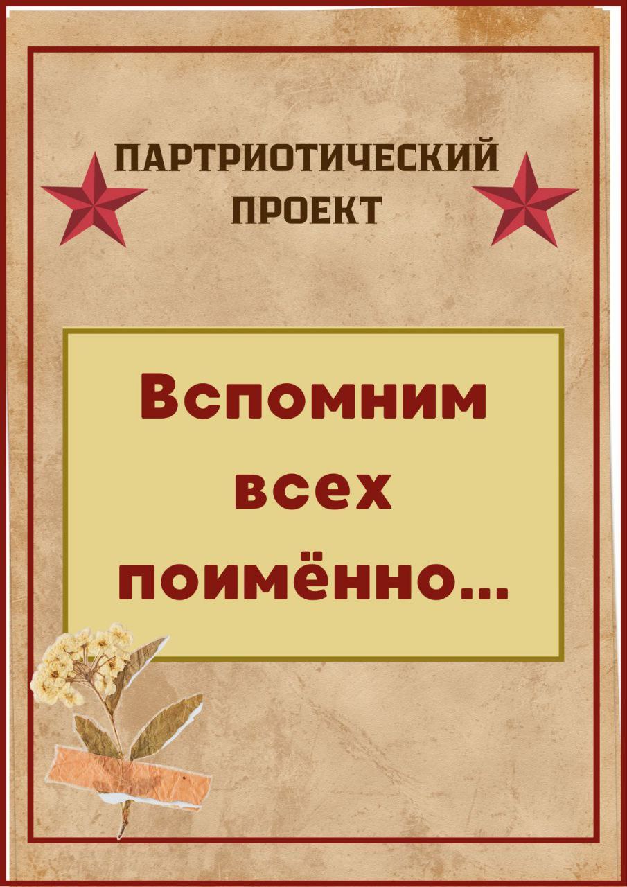 Патриотический проект «Вспомним всех поименно…» создан государственным учреждением культуры «Центр истории и культуры Октябрьского района» 80 лет - на пути к победе 03 Апр 2025 960 Цель проекта: увековечивание памяти наших соотечественников, сражавшихся против нацизма в годы Великой Отечественной войны. Молокович Семён Тимофеевич Чернецкий Антон Адамович Синькевич Александр Александрович Чернецкий Антон Адамович Ярош Ольга Герасимовна Папруга Адам Емельянович Рудько Пётр Павлович Ахраменко Архип Филиппович Козырь Владимир Герасимович Жулега Трофим Терентьевич