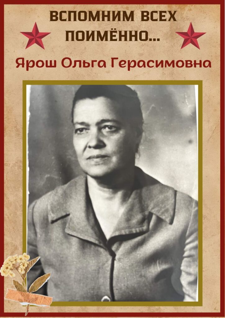 Учительница Ярош О.Г. с начала организации партизанского движения имела связь с партизанами, сообщала сведения о замыслах противника, оказывала партизанам материальную помощь.