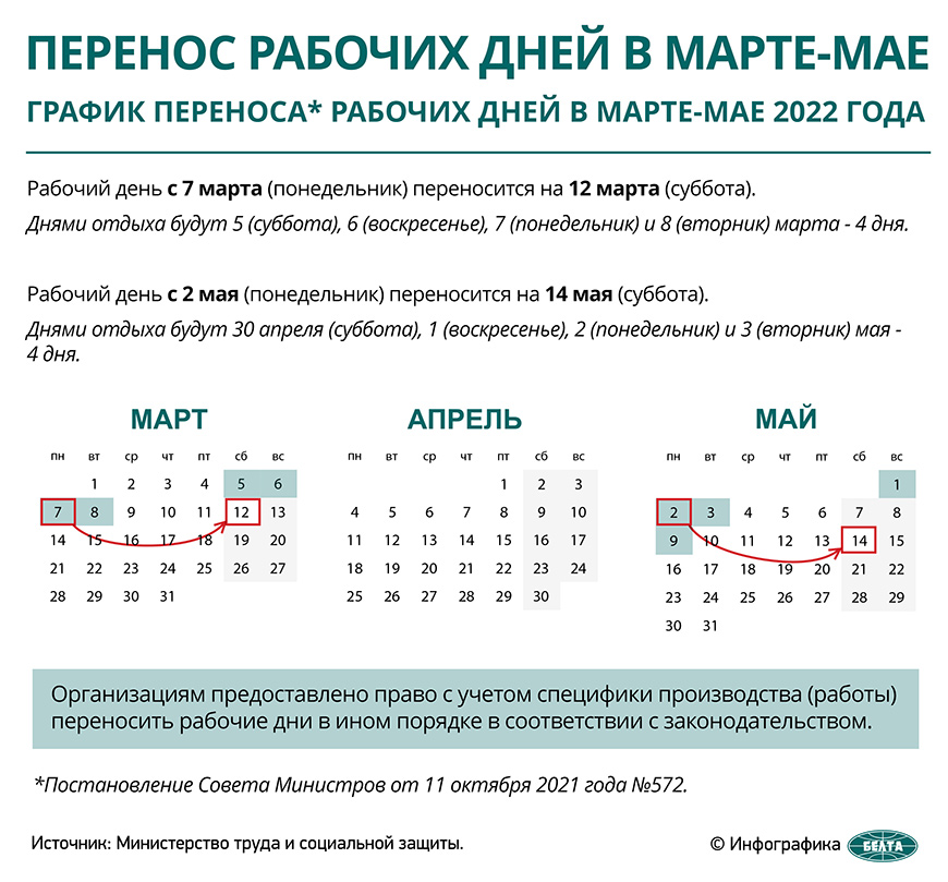 Рабочий день с 2 мая (понедельник) переносится на 14 мая (суббота).