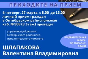 Первый заместитель председателя Октябрьского райисполкома Татьяна Новик проведет прием граждан Прием граждан 01 Июл 2024 1840