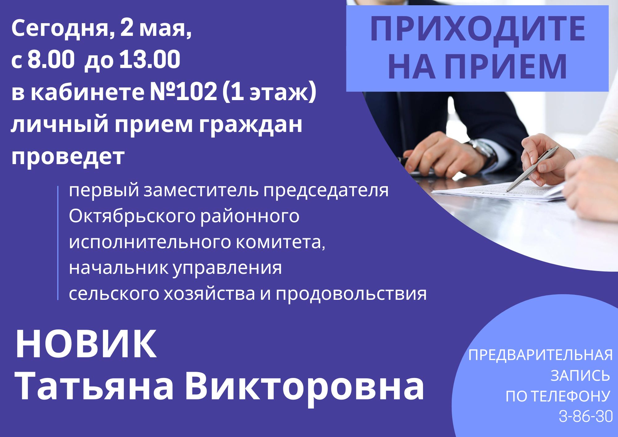 Первый заместитель председателя Октябрьского районного исполнительного комитета, начальник управления сельского хозяйства и продовольствия Татьяна Новик проведет прием граждан Важное Прием граждан 02 Май 2024 2820
