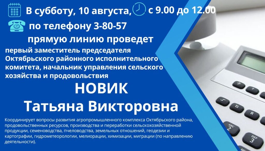 Первый заместитель председателя райисполкома Татьяна Новик проведет прямую линию Прямая линия 09 Авг 2024 1570