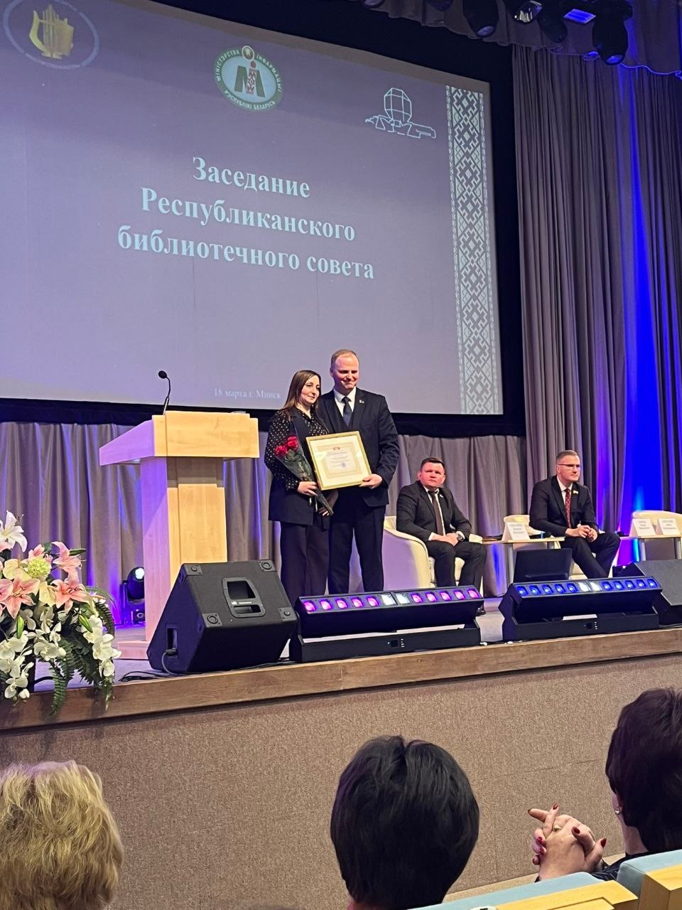 Завершилось заседание торжественной церемонией награждения. Почетной грамотой Министерства информации Республики Беларусь награжден коллектив государственного учреждения культуры «Октябрьская районная библиотека» за реализацию задач государственной информационной политики, активное участие в популяризации книги и чтения ( директор районной библиотеки Шейко Светлана Николаевна).