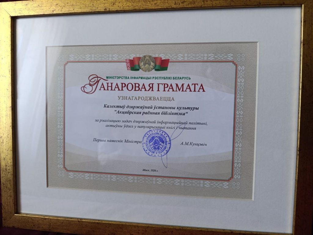 Почетной грамотой Министерства информации Республики Беларусь награжден коллектив Октябрьской районной библиотеки
