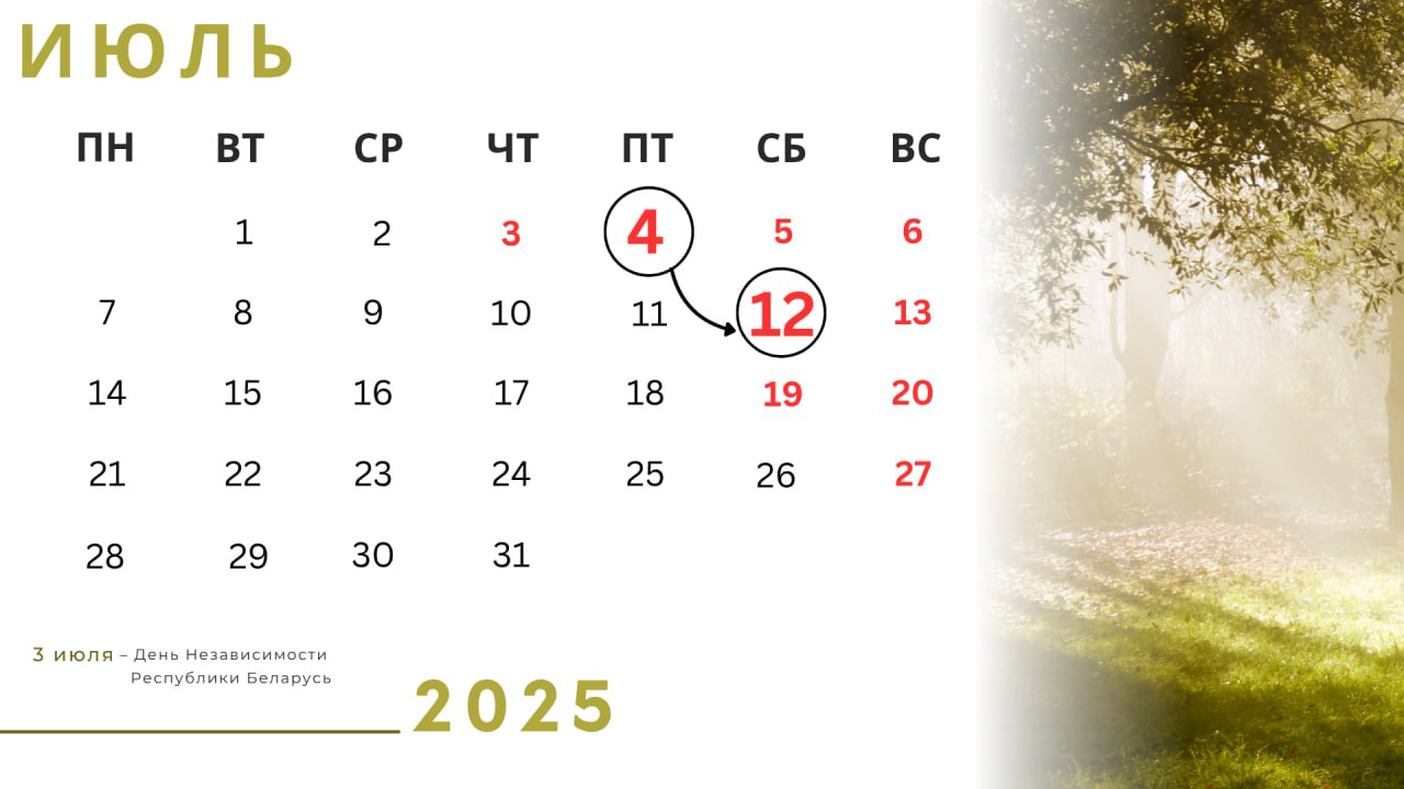 В ведомстве напомнили, что 3 июля (четверг) — День Независимости Республики Беларусь. Эта дата является официальным выходным днем в стране. Рабочий день с 4 июля (пятница) переносится на 12 июля (суббота), что обеспечит непрерывные выходные с 3 по 6 июля — всего четыре дня.
