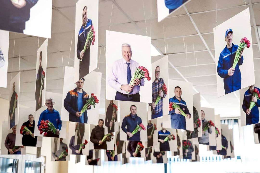 По всему холлу были развешены 115 портретов мужчин-заводчан, которые держали в руках цветы и поздравляли женщин с праздником
