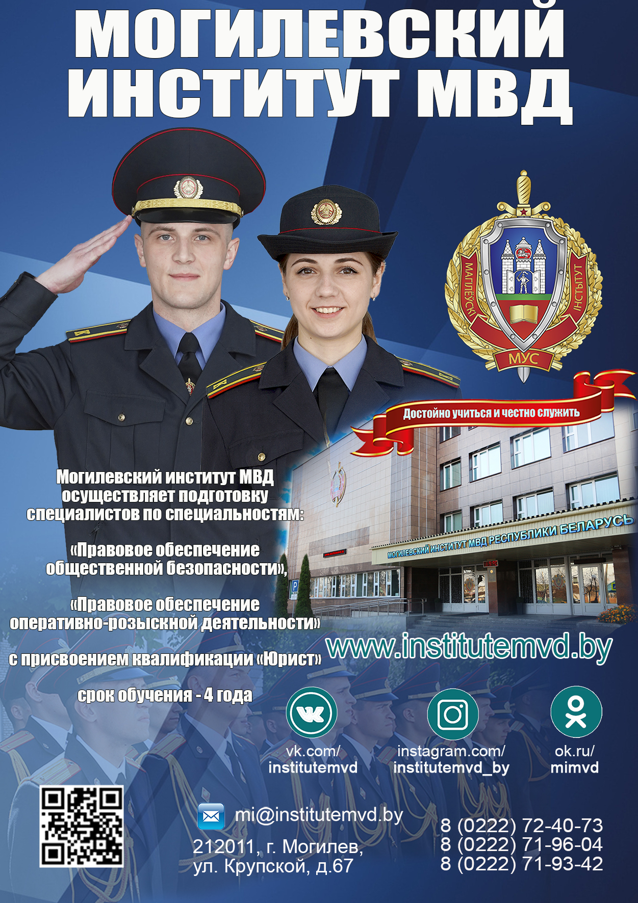 С 8 ноября 2021 года по 15 апреля 2022 года отдел внутренних дел Октябрьского райисполкома принимает заявления от граждан в возрасте от 17 до 25 лет, желающих участвовать в конкурсе на получение высшего образования 1 ступени в учреждении образования «Академия МВД Республики Беларусь» (г. Минск) по специальности «Правоведение», квалификации «юрист» или в учреждении образования «Могилевский институт МВД Республики Беларусь» (г. Могилев) по специальностям «Правовое обеспечение общественной безопасности», «правовое обеспечение оперативно-розыскной деятельности», квалификация «юрист».