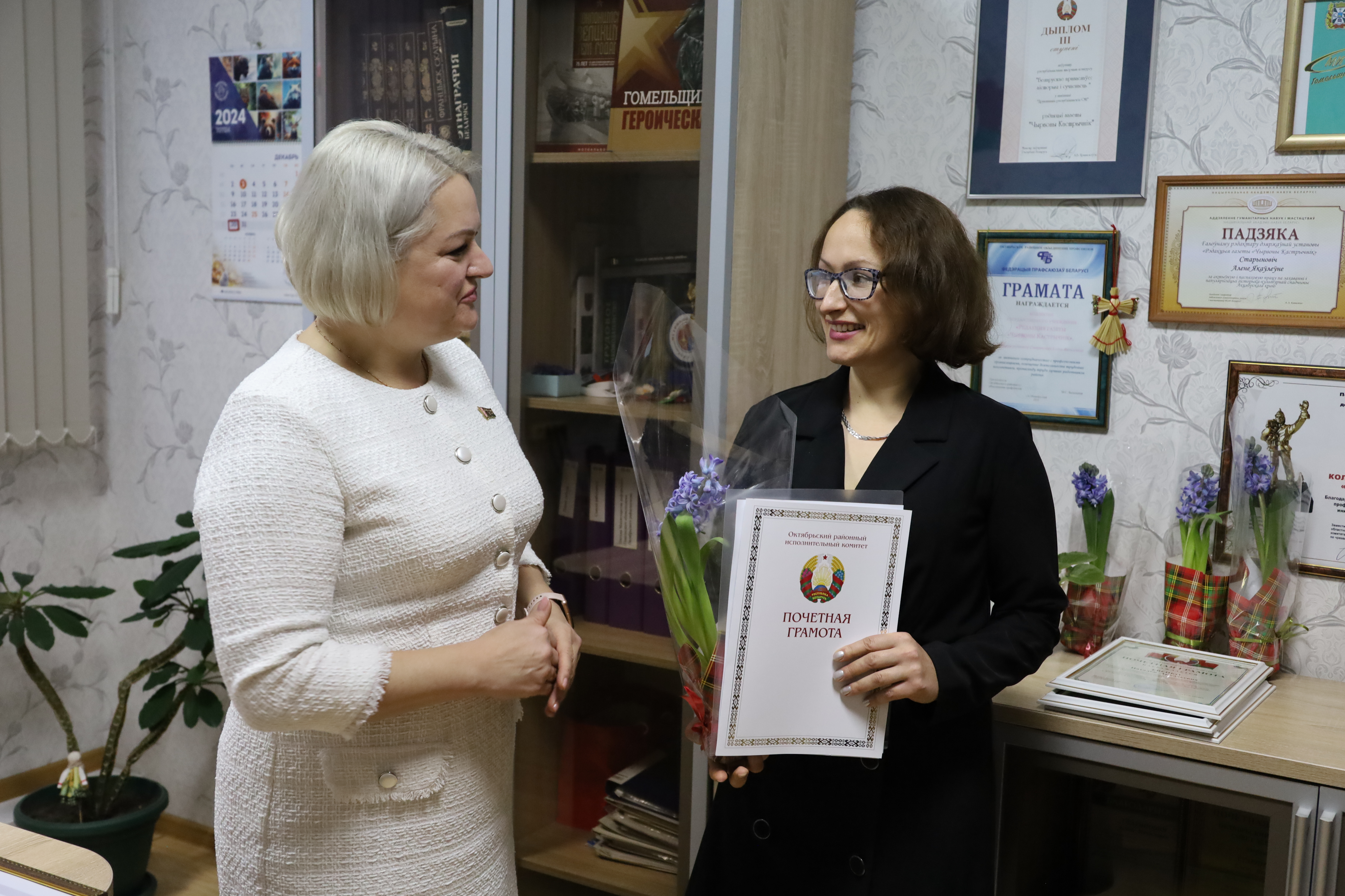 Председатель райисполкома Ирина Намоченка вручила главному редактору Елене Старинович денежный сертификат на укрепление материальной базы учреждения.