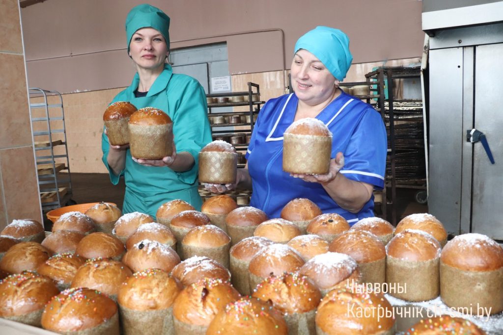 Как уточнила директор Октябрьского филиала Гомельского областного потребительского общества  Тамара Казакевич, к праздничной дате промышленное производство работает в усиленном режиме, на который перешли с конца марта. Технологи разрабатывают новые рецептуры, придумывают оформление куличей, подбирают упаковку, чтобы один из символов Светлого праздника был на столе у каждого октябричанина. На прилавки местных магазинов, и не только, поступит около 10 наименований пасхальной продукции. Ассортимент включает куличи, булки, кексы, рулеты, другие мучные сладости. Из новинок – сдоба «Велікодная» с творогом, а также с корицей и грушей. По новому рецепту работники испекут «Пасочку Пасхальную» с маковой начинкой, отмечает Тамара Евгеньевна. Первая партия пасхального ассортимента в магазинах района появилась уже 3 апреля, накануне католической Пасхи. Организована и выездная торговля красочной, аппетитной сдобой. Можно купить куличи на горпоселковом рынке. Будет в продаже пасхальная выпечка и в торговых объектах соседних районов. Доставят пасхальную продукцию в ассортименте и автолавки сельчанам. Потребность каждого покупателя работники хлебозавода и кондитерского цеха постараются обеспечить в полной мере. Они предлагают пасхальную сдобу от самых маленьких 300-граммовых куличей до полукилограммовых булок.
