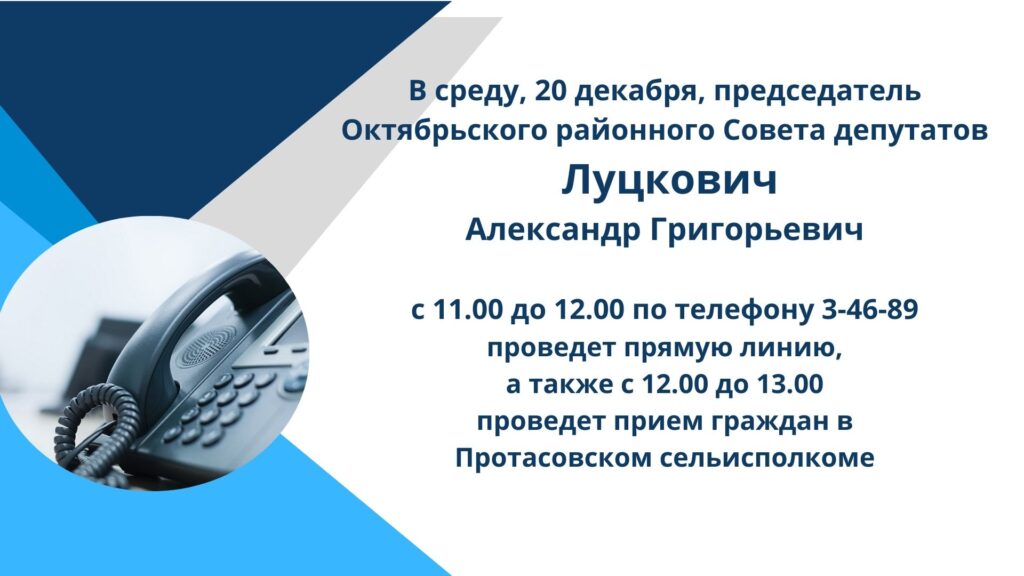 Председатель Октябрьского райсовета депутатов Александр Луцкович проведет прямую линию и прием граждан в Протасовском сельисполкоме Общество 19 Дек 2023 2180