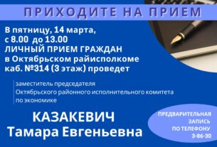 10 июля прием граждан проведет первый заместитель председателя Октябрьского райисполкома, начальник управления сельского хозяйства и продовольствия Татьяна Новик Прием граждан 09 Июл 2024 2280