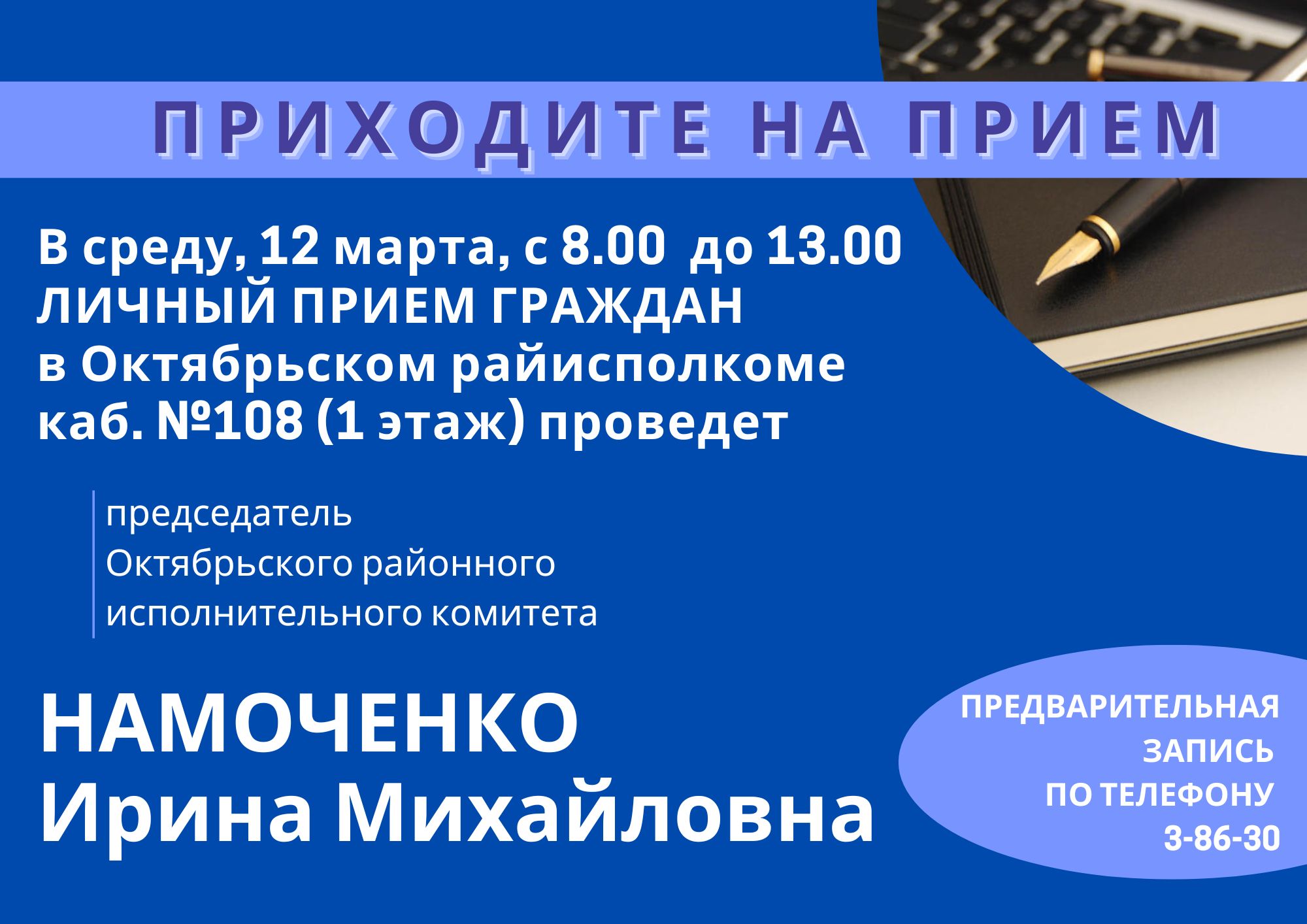 Прием граждан проведет председатель Октябрьского райисполкома Ирина Намоченко Прием граждан 10 Мар 2025 720