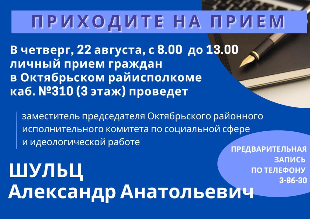 Прием граждан проведет заместитель председателя Октябрьского райисполкома Александр Шульц Общество 21 Авг 2024 1760