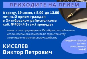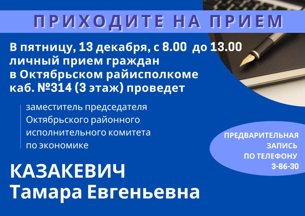 Прием граждан проведет заместитель председателя Октябрьского райисполкома Тамара Казакевич Прием граждан 12 Дек 2024 650