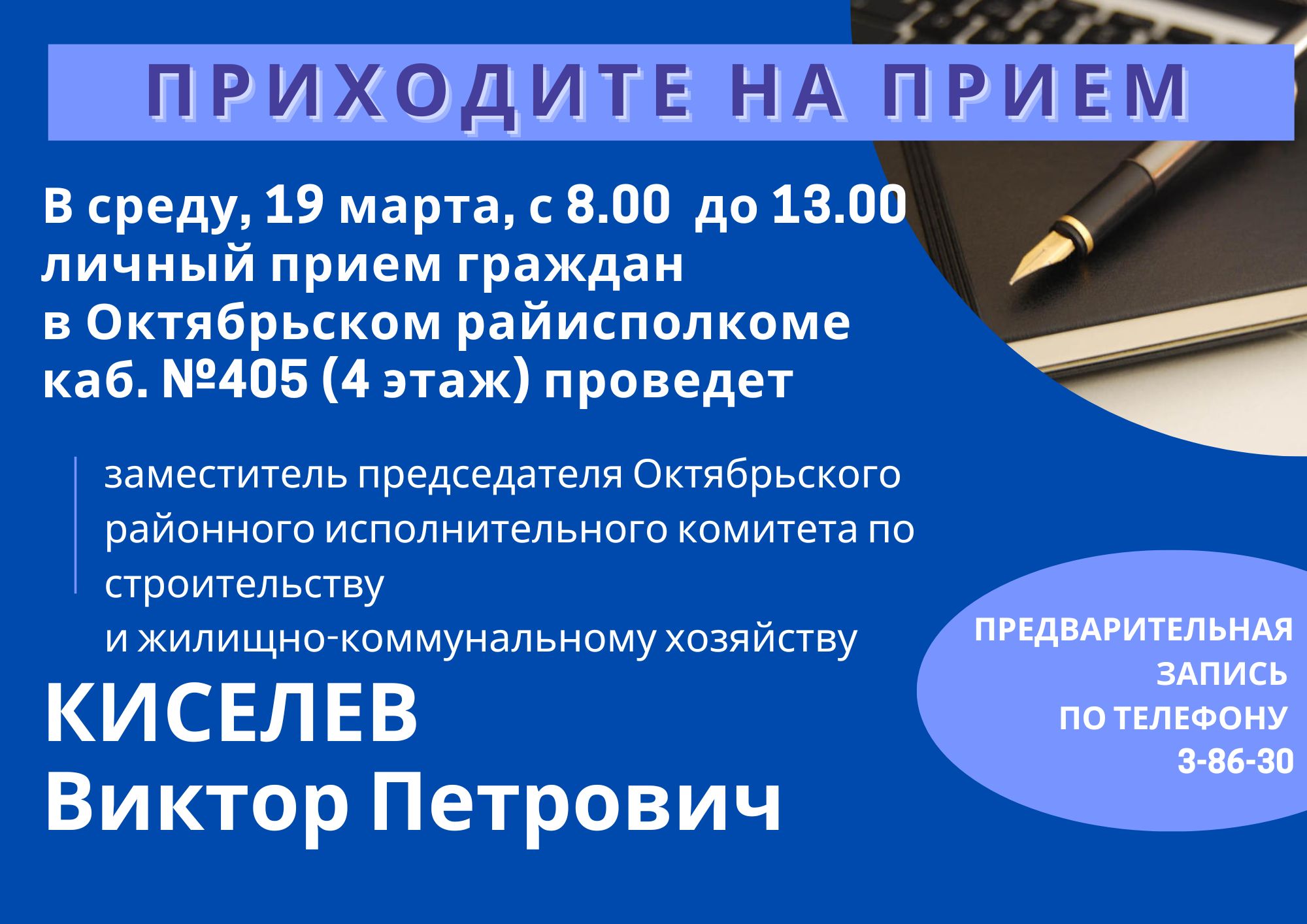 Прием граждан проведет заместитель председателя Октябрьского райисполкома Виктор Киселев Прием граждан 18 Мар 2025 430