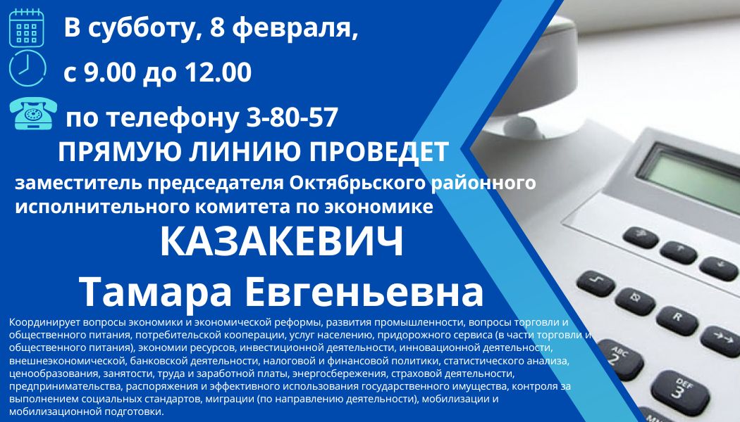 Прямую линию проведет заместитель председателя Октябрьского райисполкома по экономике Тамара Казакевич Прямая линия 07 Фев 2025 730