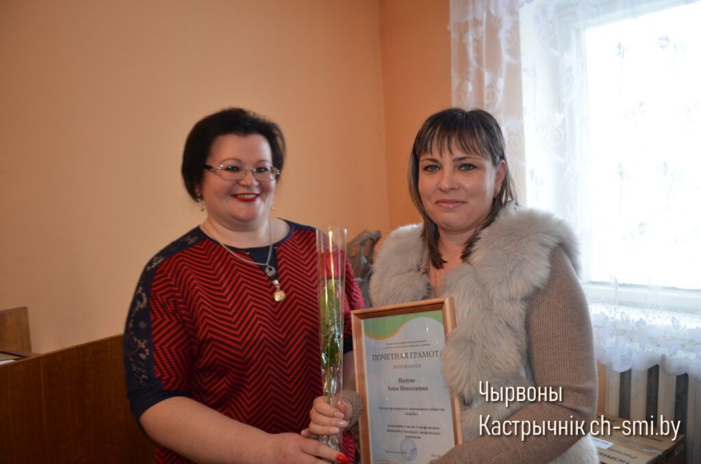На данном мероприятии также были вручены заслуженные профсоюзные награды лучшим труженикам ОАО «Дербин» на текущем этапе. Так, Почетной грамоты Гомельского обкома профсоюза работников АПК удостоена оператор машинного доения Марина Певнева, Почетной грамоты Октябрьской районной профсоюзной организации агропромышленного комплекса – главный экономист, председатель профкома ОАО «Дербин» Валентина Цурко, а Благодарностями этой же организации одновременно и в рамках акции «Наш животновод» отмечены работницы МТФ «Дербин» Антонина Кононова и Татьяна Король. За активное участие в профсоюзном движении и поддержку профсоюзных инициатив Почетными грамотами «первички» ОАО «Дербин» были награждены руководитель хозяйства Сергей Якуш и бухгалтер Анна Полуян. Также на завершение собрания ценными подарками были поощрены 40 человек из трудового коллектива данной сельхозорганизации за верность своим профессиям на протяжении последних 15 лет и внесшим большой личный вклад в развитие и совершенствование родного хозяйства.