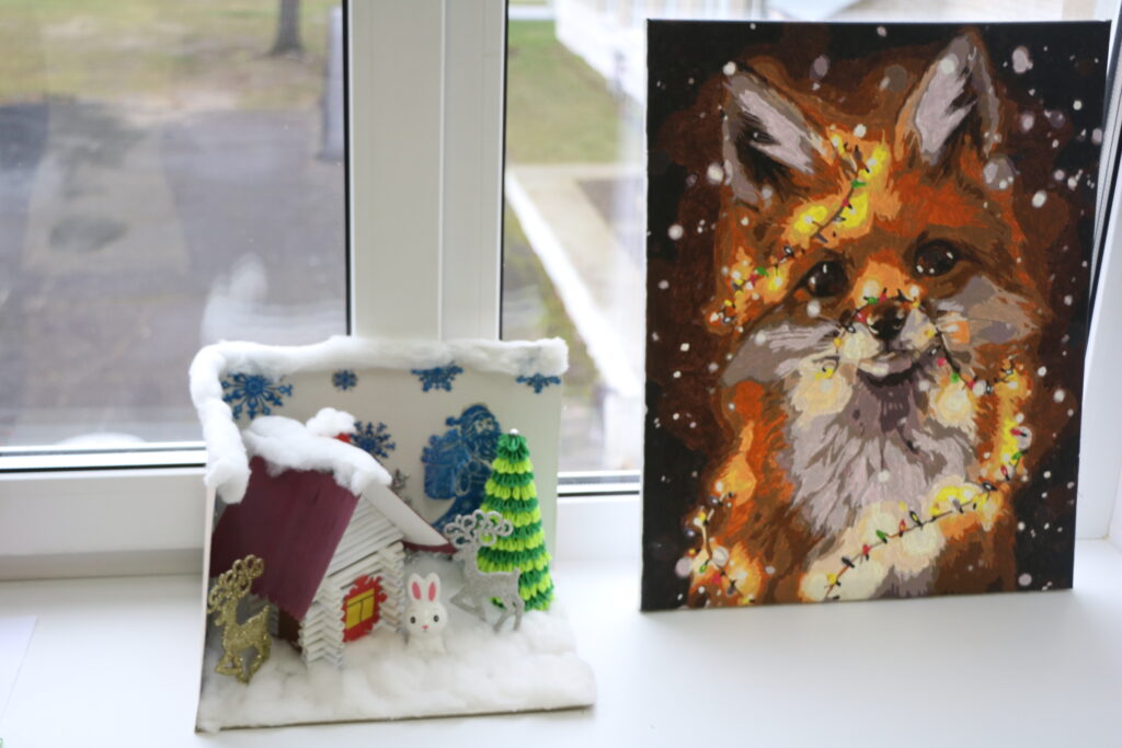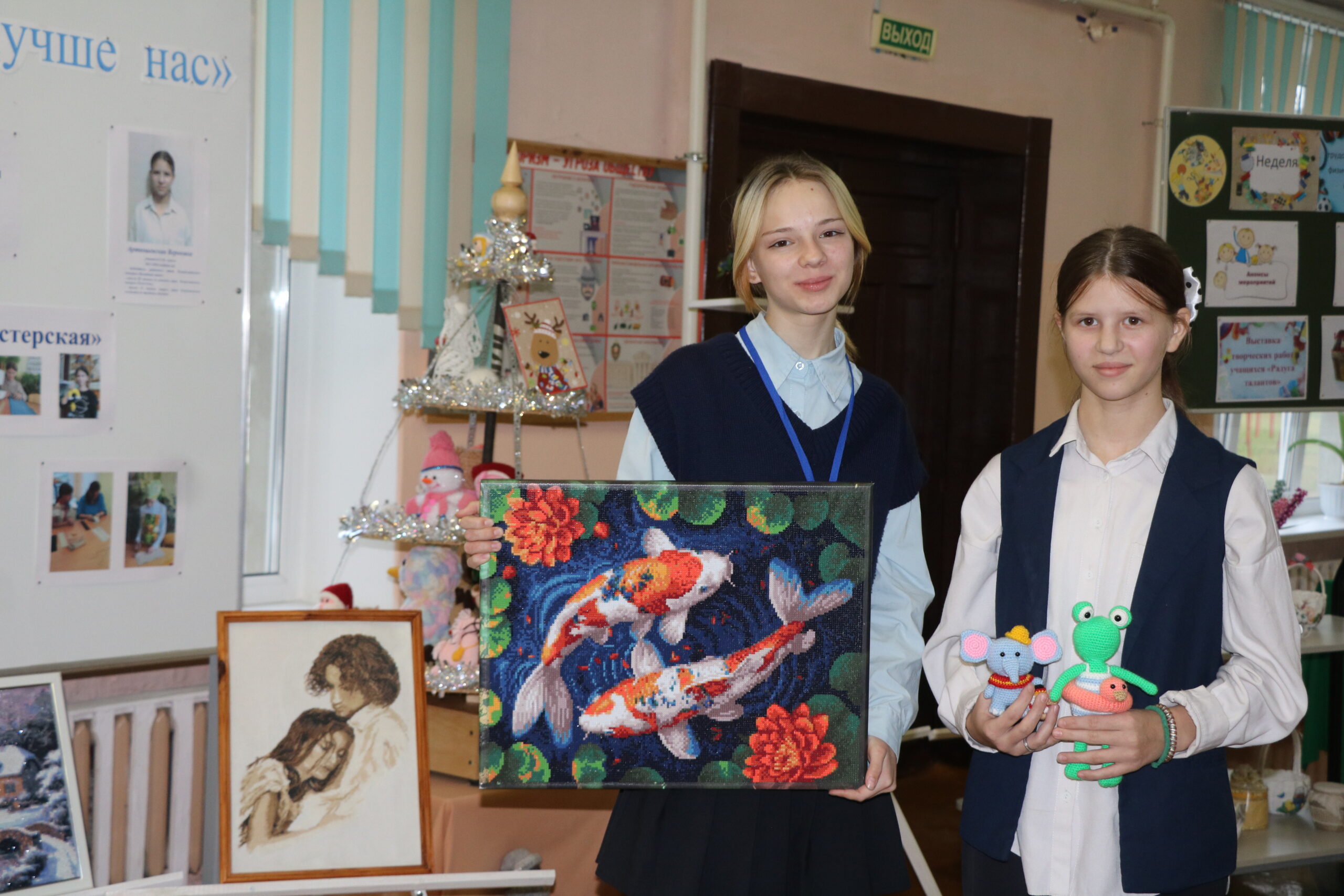 Мы побеседовали с девятиклассницей Яниной Кособуцкой и восьмиклассницей Вероникой Артюшевской, работы которых представлены на выставке «Радуга талантов» в фойе школы.
