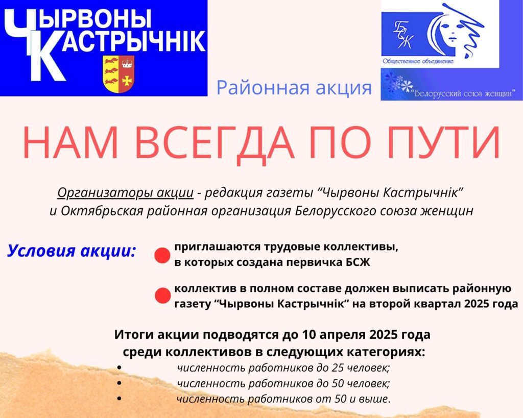 Редакция газеты “Чырвоны Кастрычнік” и Октябрьская районная организация Белорусского союза женщин проводят районную акцию «Нам всегда по пути» Акция Реклама, объявления 11 Мар 2025 2050