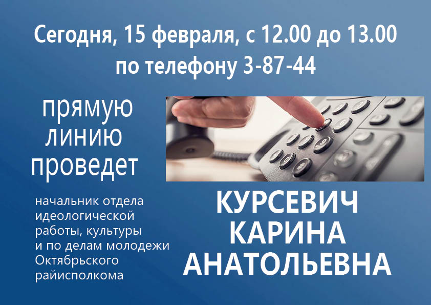 Сегодня , 15 февраля, состоится прямая линия с начальником отдела идеологической работы, культуры и по делам молодежи Октябрьского райисполкома Кариной Курсевич Прямая линия 15 Фев 2023 2040