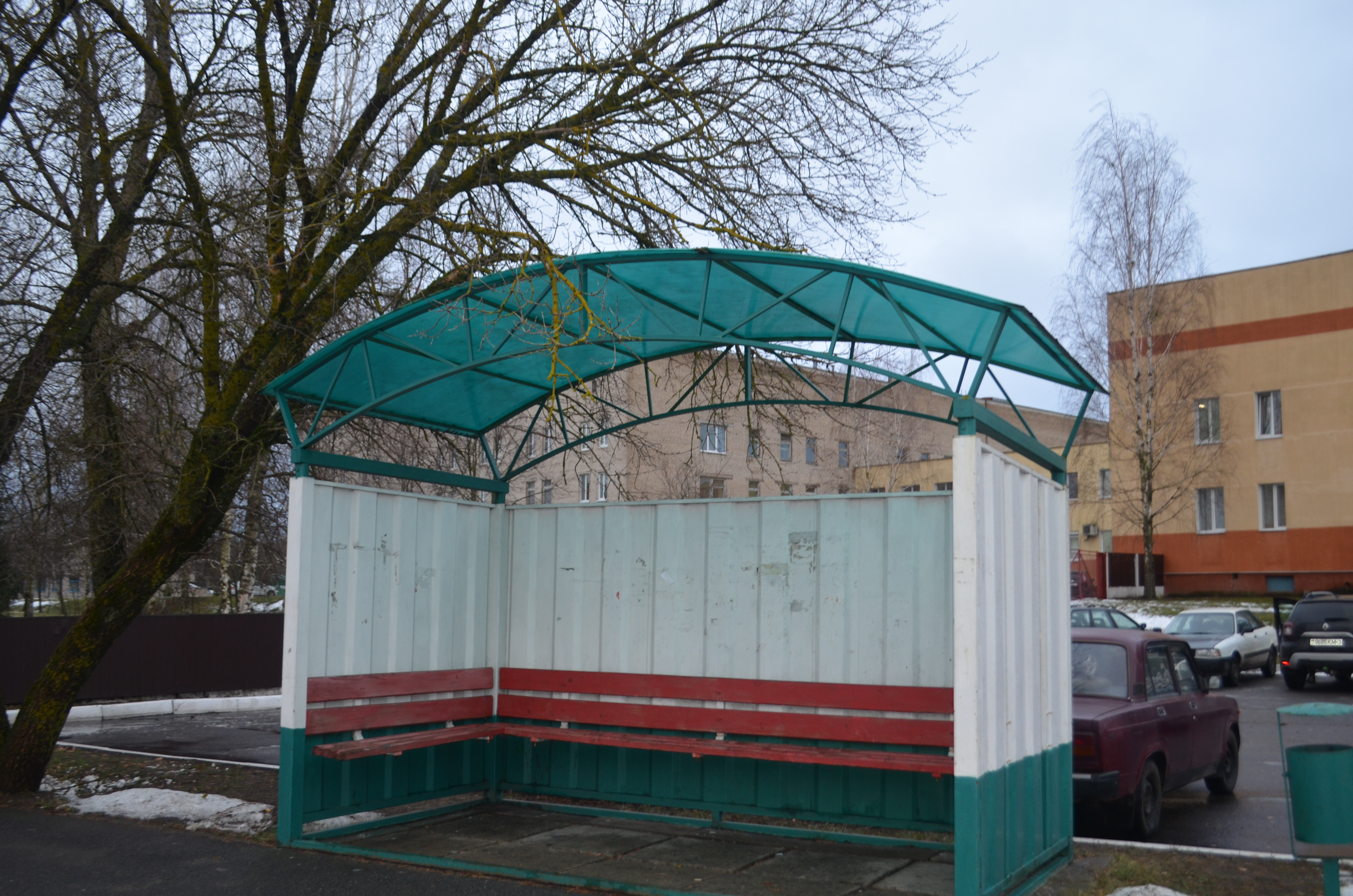 Остановочный павильон, который расположен по улице Калинина в горпоселке, виден издалека. Во-первых, он занимает удобное месторасположение, поскольку находится недалеко от центральной районной больницы, во-вторых, эта прочная, крепкая конструкция защищает от дождя, снега и ветра ожидающих автобус, что немаловажно.