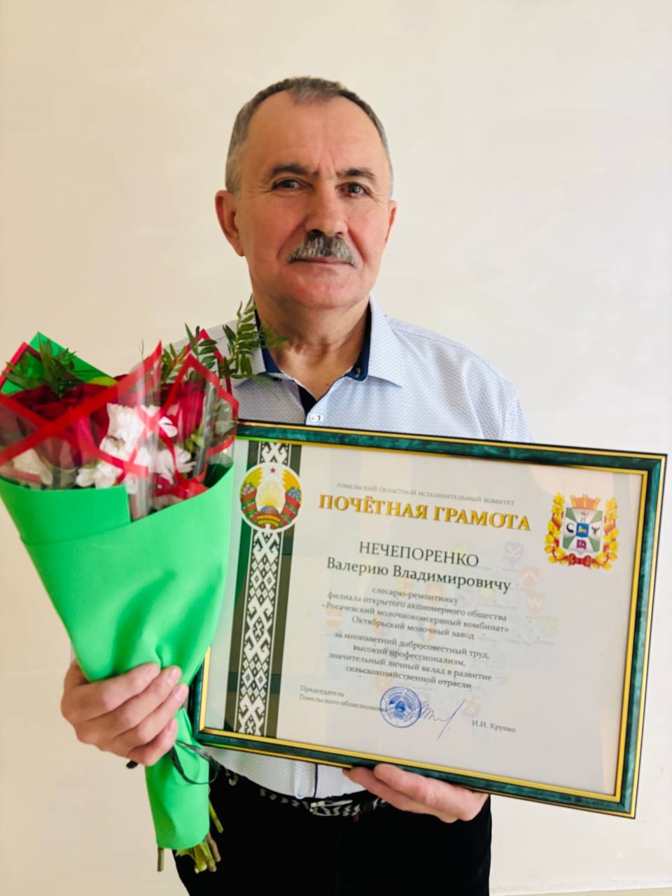 И как подтверждение сказанному – недавняя высокая награда слесаря-ремонтника филиала «Рогачевский МКК» Октябрьский молочный завод Валерия Нечепоренко. На областном мероприятии по случаю Дня работников сельского хозяйства и перерабатывающей промышленности АПК ему была вручена Почетная грамота Гомельского областного исполнительного комитета. Поздравляем!