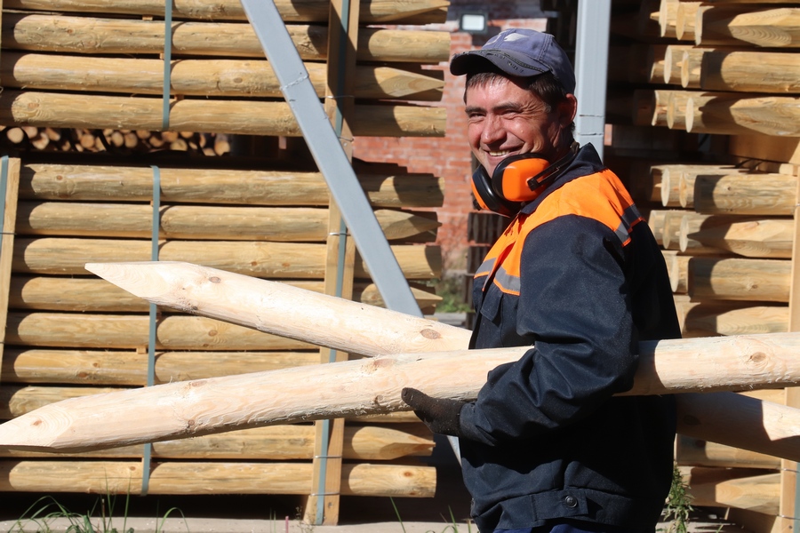 Иван Рейн в цеху деревообработки второй год. До этого десять лет трудился на погрузке вагонов на станции «Рабкор». А с запуском нового цеха, Иван переквалифицировался и перешел туда станочником. Сейчас на современном высокотехнологичном оборудовании станочник обрабатывает древесину. Иван выпускает оцилиндрованную продукцию. Он предельно точно знает свое дело, чтобы эффективно использовать новые деревообрабатывающие станки. С их помощью быстро и качественно снимает кору с мелкотоварной древесины, затачивает колья и упаковывает готовый товар в поддоны. За смену Иван выпускает 3,5 кубометров оцилиндрованных кольев самого ходового диаметра 1 метр 65 сантиметров, уточняет мастер смены Сергей Быков и поясняет, что это примерно 4-5 поддонов готовой продукции, которую станочники сами упаковывают по определенной технологии, и складируют для дальнейшей отгрузки.