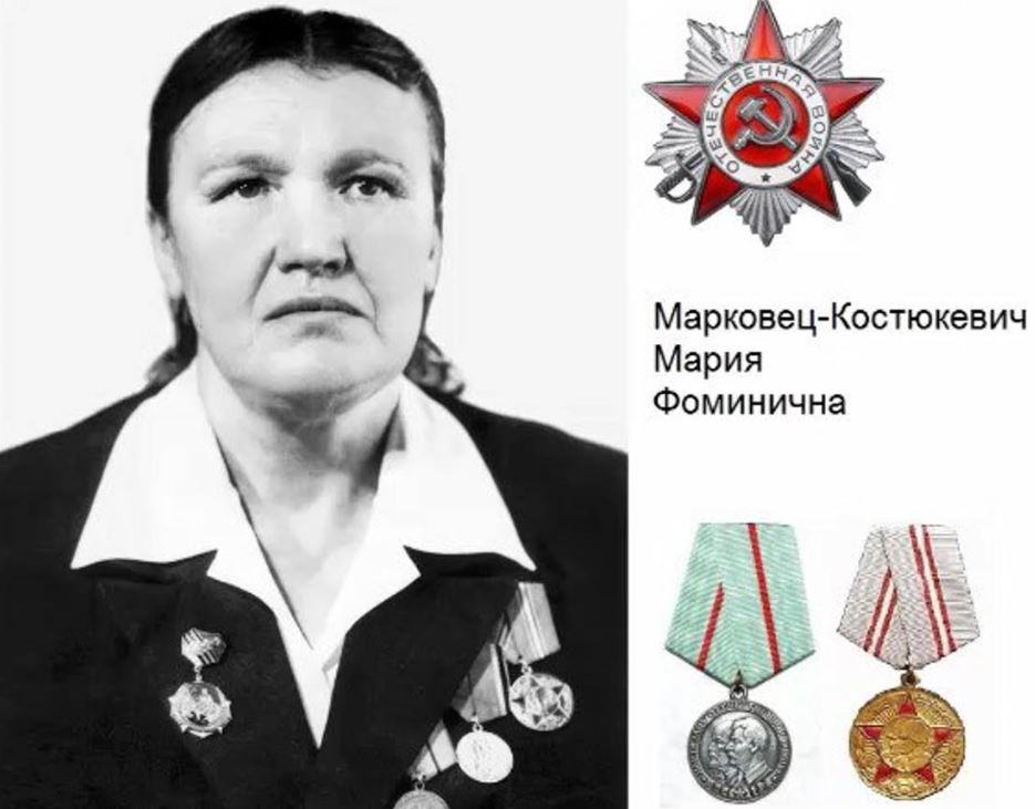 Сестра моего прадеда Мария Фоминична Марковец (Костюкевич), 1921 года рождения, во время войны, рискуя жизнью, работала санитаркой в партизанском госпитале.