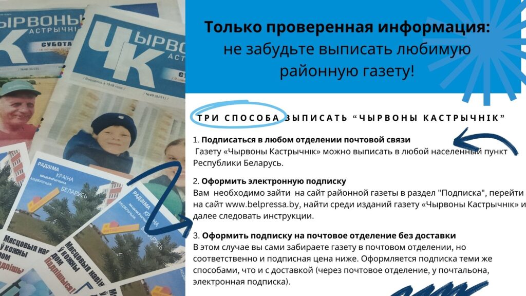 Вы можете подписаться на «Чырвоны Кастрычнік» не выходя из дома и не обращаясь на почту, но газета все равно придет к вам домой. Для того, чтобы оформить электронную подписку вам необходимо зайти на сайт районной газеты в раздел «Подписка», перейти на сайт www.belpressa.by, найти среди изданий газету «Чырвоны Кастрычнік» и далее следовать инструкции.