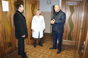 Подпись под фото: во время посещения учреждения здравоохранения «Поречская амбулатория врача общей практики» Олег Таргонский, медсестра Татьяна Мардас и Евгений Адаменко.