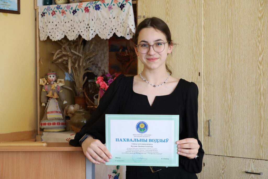 Напомним, что Доминика Козлова учится в 8 классе, а в составе областной команды выступала в олимпиаде для девятиклассников. Старания и крепкие знания гимназистки из Октябрьского не остались незамеченными членами жюри. Доминика была отмечена Благодарственным письмом и специальным призом от Министра образования Республики Беларусь Андрея Иванца в номинации «За творчы беларусазнаўчы патэнцыял».