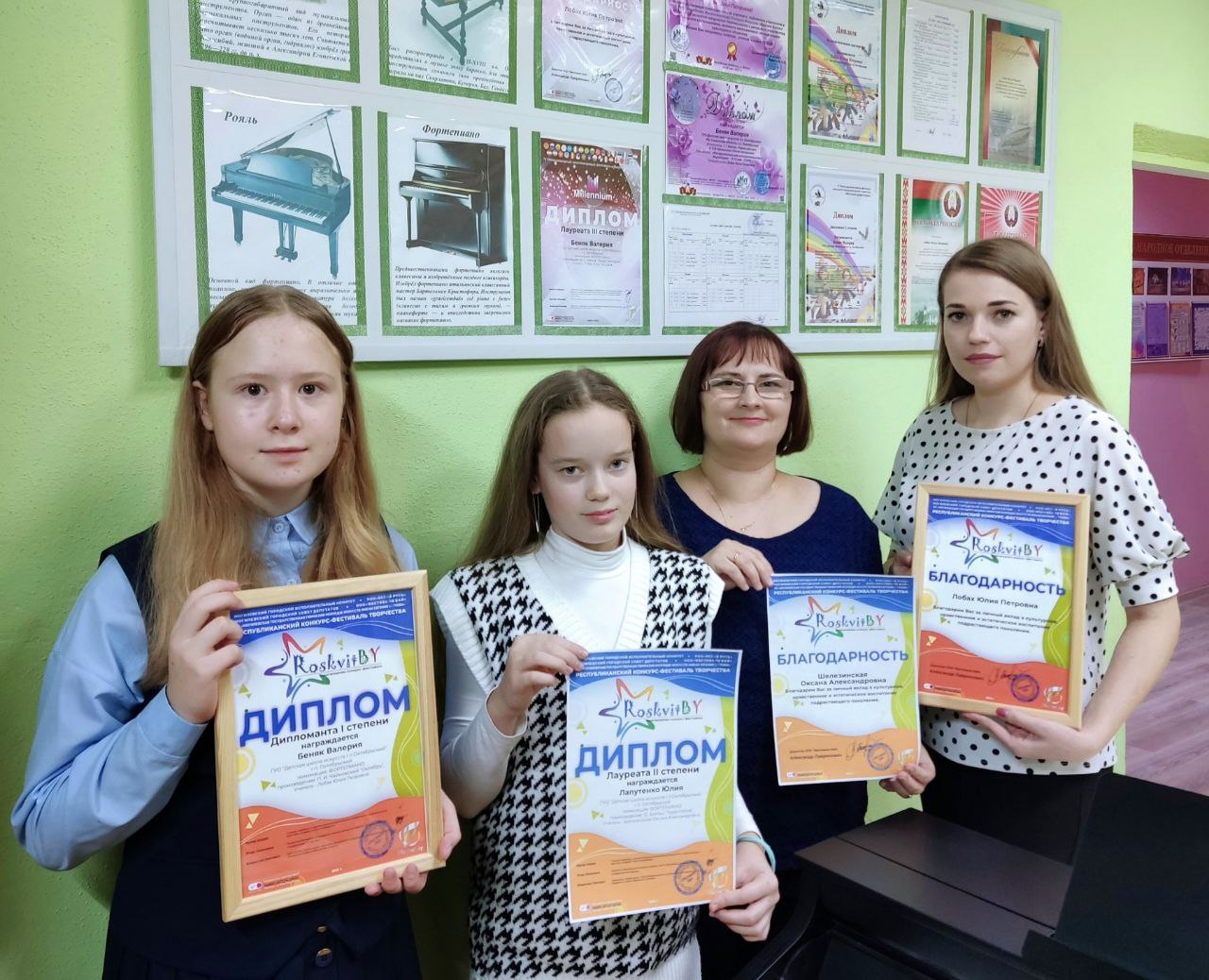 Дипломом Лауреата II степени награждена Лапутенко Юлия, учитель Шелезинская О. А.; дипломом Лауреата III степени награждена Левковская Яна, учитель Таргонская М. А., концертмейстер Мытник Д.Н.; дипломом Дипломанта I степени награждена Беняк Валерия, учитель Лобах Ю. П. Учителя награждены благодарностями за личный вклад в культурное и эстетическое воспитание подрастающего поколения.