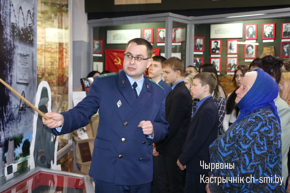 Вначале экскурсию по экспозиции «Геноцид. Без срока давности…» провел прокурор Октябрьского района Анатолий Новик. Приглашенные – учащиеся средней школы №1 г.п. Октябрьский имени А. Р. Соловья и районной гимназии, бывшие узники концлагеря «Озаричи». Затем в актовом зале прошла диалоговая площадка на тему «За колючей проволокой»