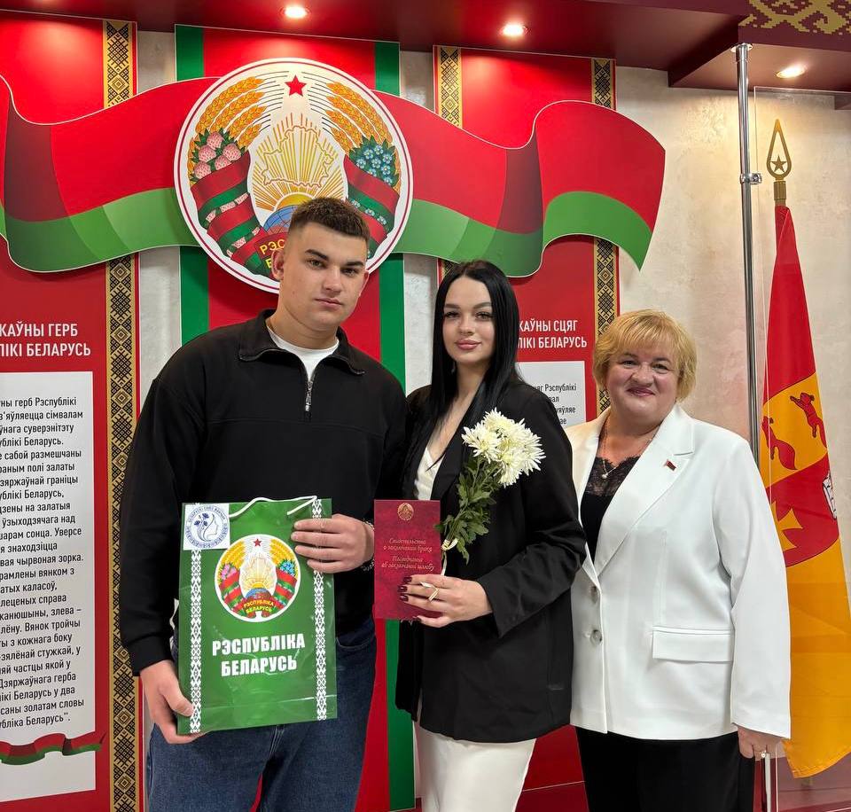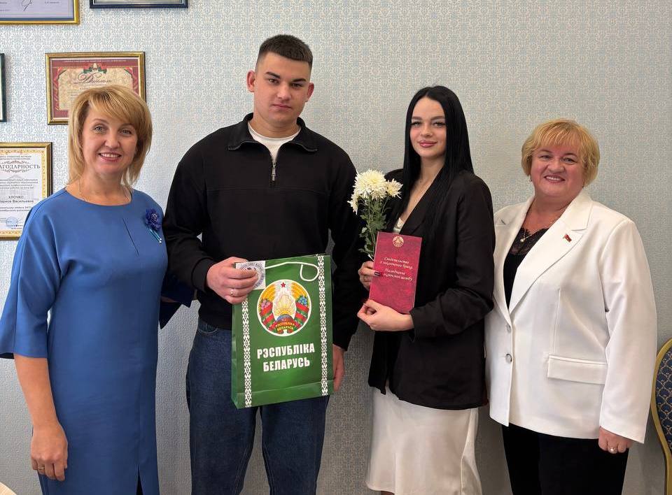 С таким замечательным событием молодоженов поздравила председатель районной организации общественного объединения «Белорусский союз женщин» Валентина Шлапакова: