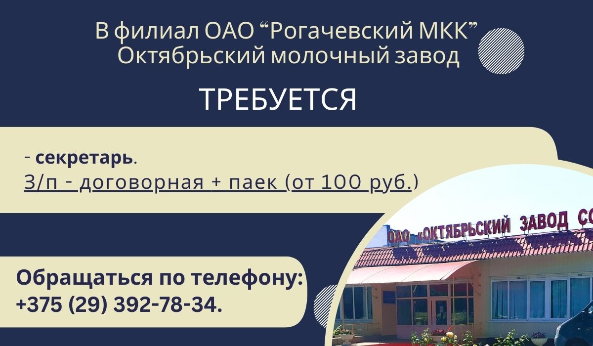 В филиал ОАО “Рогачевский МКК” Октябрьский молочный завод требуется секретарь Реклама, объявления 11 Мар 2026 2540