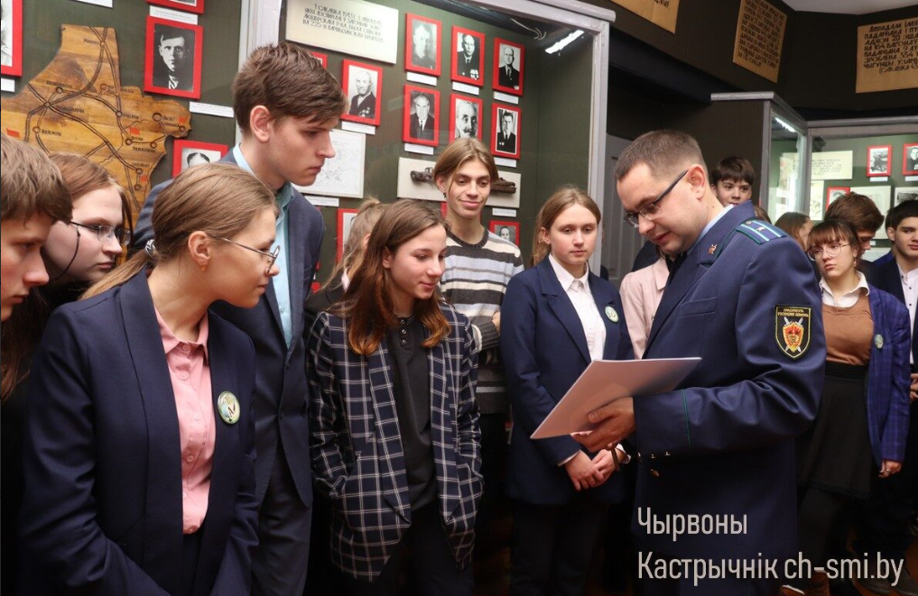 В Международный день памяти жертв преступления геноцида коллектив прокуратуры Октябрьского района во главе с прокурором Анатолием Новиком провел урок памяти для учащихся старших классов средней школы №1. Мероприятие прошло в центре истории культуры возле реэкспозиции «Геноцид без срока давности», приуроченной к Году исторической памяти. Анатолий Александрович рассказал ребятам о результатах уголовных дел в отношении геноцида белорусского народа в годы Великой Отечественной войны на территории Октябрьского района.