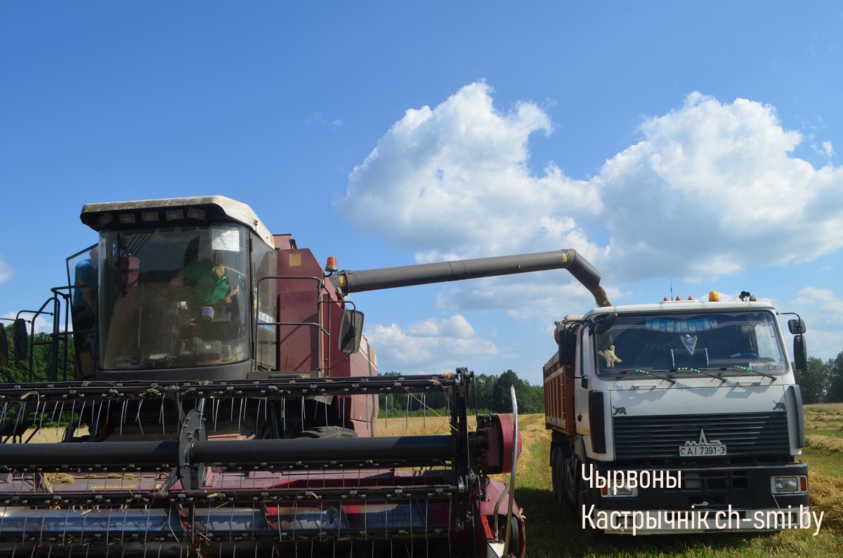 Всего на жатве текущего года в ОАО «Моисеевка» работают 5 зерноуборочных комбайнов, они выходят на хлебную ниву все вместе и поступательно, единым звеном, движутся дальше. Вот такой караван местных «степных кораблей» мы и застали во время рейда в урочище Дуброва близ деревни Черные Броды. Экипажи комбайнеров Юрия Лазуренко и Сергея Бобкова, Сергея Новака и Сергея Крука, Ивана Котлярова и Дмитрия Расюка (молодежный), а также Виталия Дашкевича и Владимира Каранца (двое последних работают без помощников) убирали озимую рожь на 46-гектарной площади. К качеству обмолота по проверенным валкам свежей соломы претензий не возникло – видно, что жатки и другие механизмы комбайнов надежно отрегулированы, да и сами хлеборобы соблюдали технологию при скашивании колосьев, уборку вели размеренно, но в то же время не допускали простоев, чему способствовала организация бесперебойной отвозки зерна от комбайнов. Для этих целей задействован собственный самосвал МАЗ, а также привлечены 2 «двадцатитонника» из Октябрьской ПМК-37. Весь собранный урожай поступает на зерноток в Мойсеевку, где зерно сушится и очищается от сорных примесей.