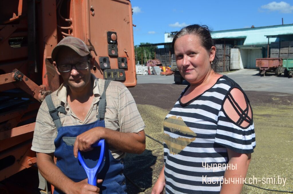 Чтобы не допустить потерь лучшего за последние годы урожая, на жатве озимого рапса в сортстанции решили использовать комбайн КЗС-1218, арендованный в соседнем хозяйстве – ОАО «Ломовичи». Машина не новая, но работает слаженно и надежно. В состав нынешнего единственного зерноуборочного экипажа сельхозорганизации вошли одни из лучших ее работников, имеющие большой опыт работы на комбайнах в прошлые годы, – Алексей Коваленко и Юрий Шпак. Вместе с ними в дружной команде хлеборобов ГСХУ «Октябрьская сортстанция» текущего года непосредственно на спелой ниве трудятся водитель большегрузного самосвала МАЗ-555 Виктор Костюкевич, который за день делает по 3 рейса, перевозя за каждый от комбайна по 8 тонн маслосемян, и однофамилец Виктора Георгиевича Александр Костюкевич (уже пенсионер, работает в ГСХУ по договору) – он обслуживает трактор с противопожарной емкостью, что является обязательным звеном жатвы в это горячее время.
