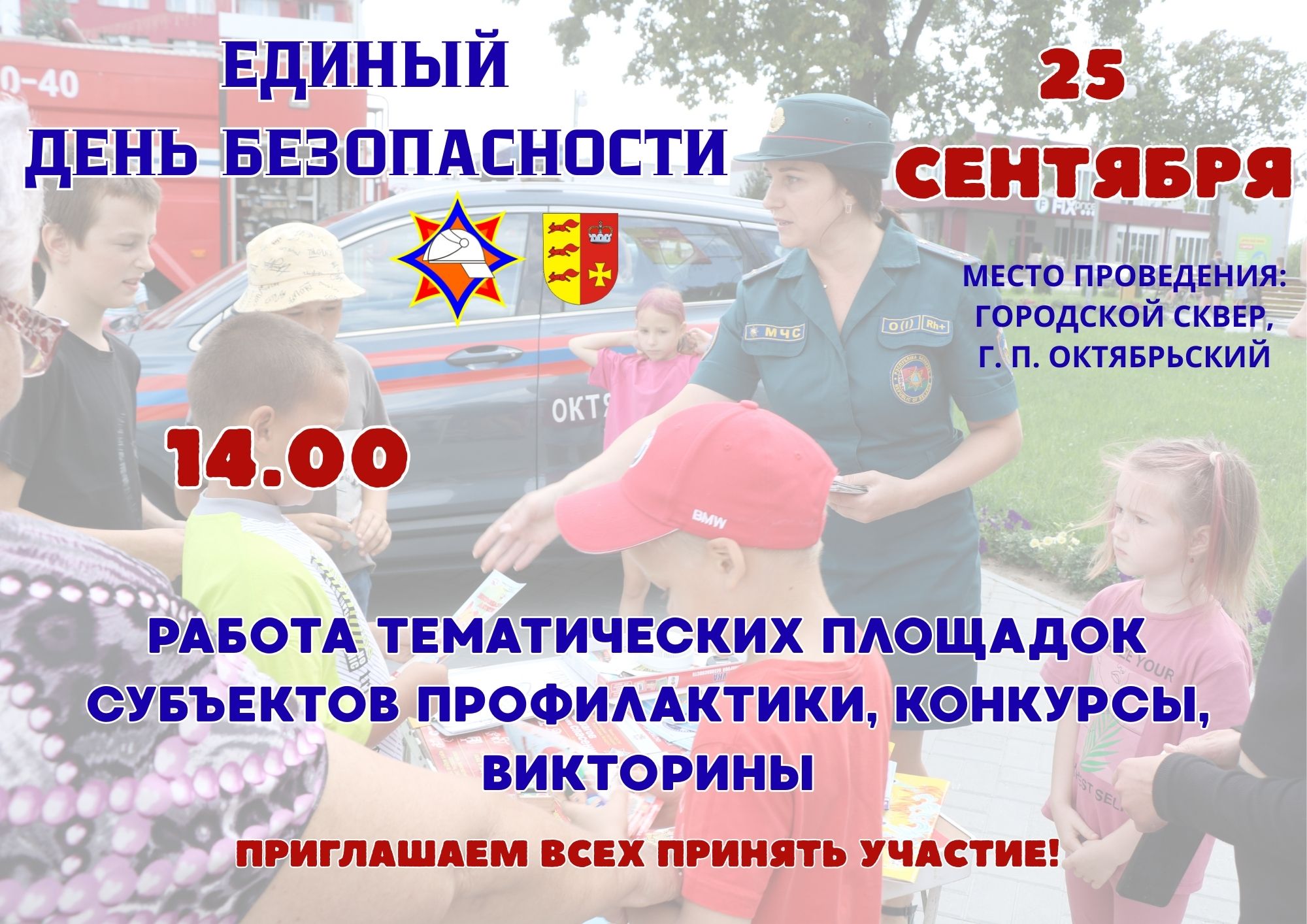 В г. п. Октябрьский большая площадка безопасности будет организована 25 сентября с 14:00 до 16:00 в городском сквере, вход свободный.