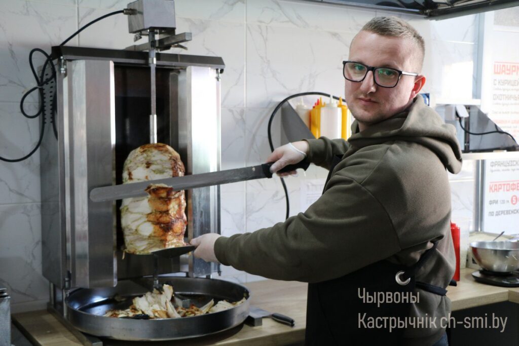 – Идея создания подобного объекта в таком небольшом городском поселке, как Октябрьский, возникла лет пять назад, – делится начинающий индивидуальный предприниматель Сергей Николаевич Гвоздов. – Но на тот момент не рискнул ее реализовать: было немного страшновато. Время шло, но мысль о собственной шаурмичной меня не покидала. Долго думал и, наконец, решил: «Шаурме быть!». А жена меня поддержала. Но перед тем, как открыться, нужно было пройти несколько подготовительных этапов, чтобы прийти к тому, что мы по итогу имеем на данный момент. Поначалу надо было найти помещение. Узнали, что как раз освобождался один из торговых павильонов, расположенных в центре горпоселка, а ведь удачная локация, как говорится, решает все. Составили бизнес-план и отправились со своим предложением в управление по труду, занятости и социальной защите Октябрьского райисполкома. План наш рассмотрели, утвердили, оказали нам государственную поддержку и предоставили субсидию на открытие собственного бизнеса. Скажу сразу, что это огромный плюс для тех, кто только начинает свое дело. Далее мы собрали необходимые документы, решили банковские нюансы, закупили оборудование, сделали ремонт помещения. Вопросов, конечно, вначале было много, но они постепенно решались. И 18 февраля наша точка открылась.
