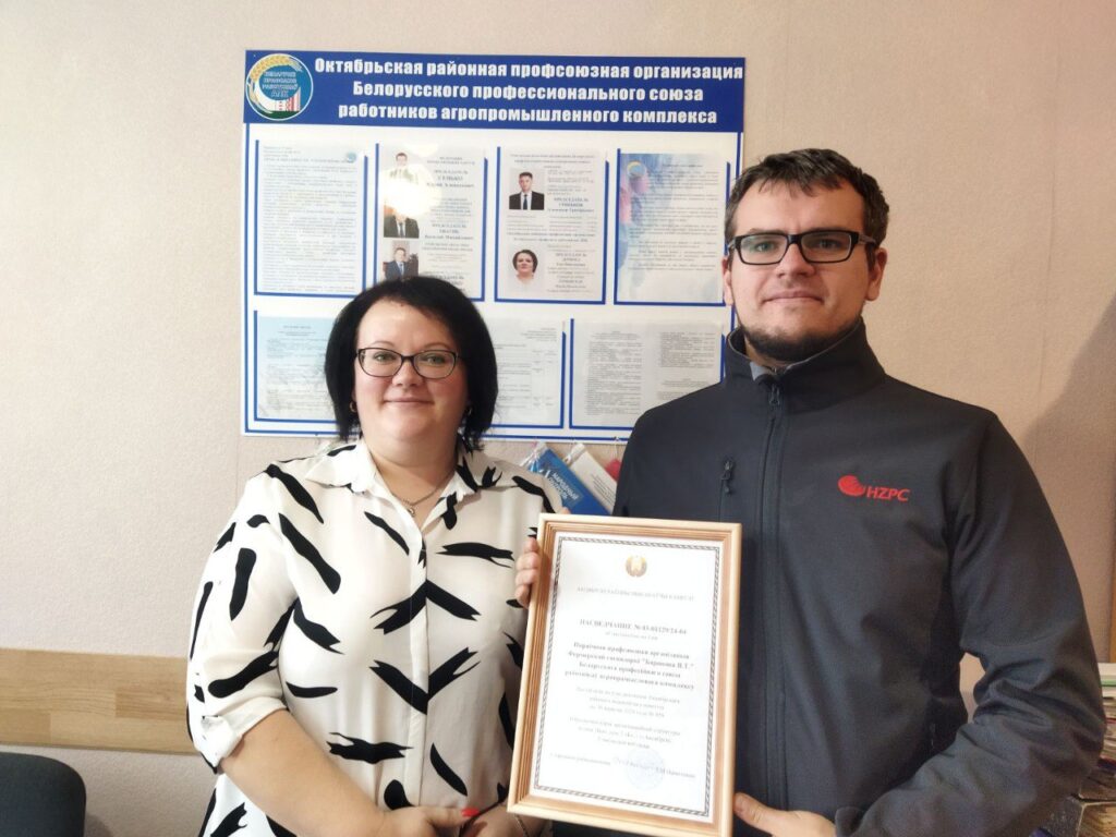 Она создана в фермерском хозяйстве «Баранова В.Т.». В ее состав вошли 9 человек, председатель первички – помощник руководителя Матвей Баранов. Свидетельство о государственной регистрации новому профсоюзному лидеру со словами поздравлений и пожеланий успехов вручила председатель районной профсоюзной организации Белорусского профсоюза работников агропромышленного комплекса Ева Дервоед.