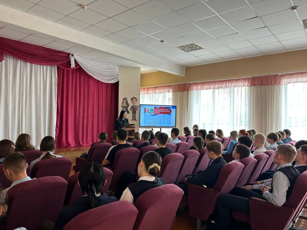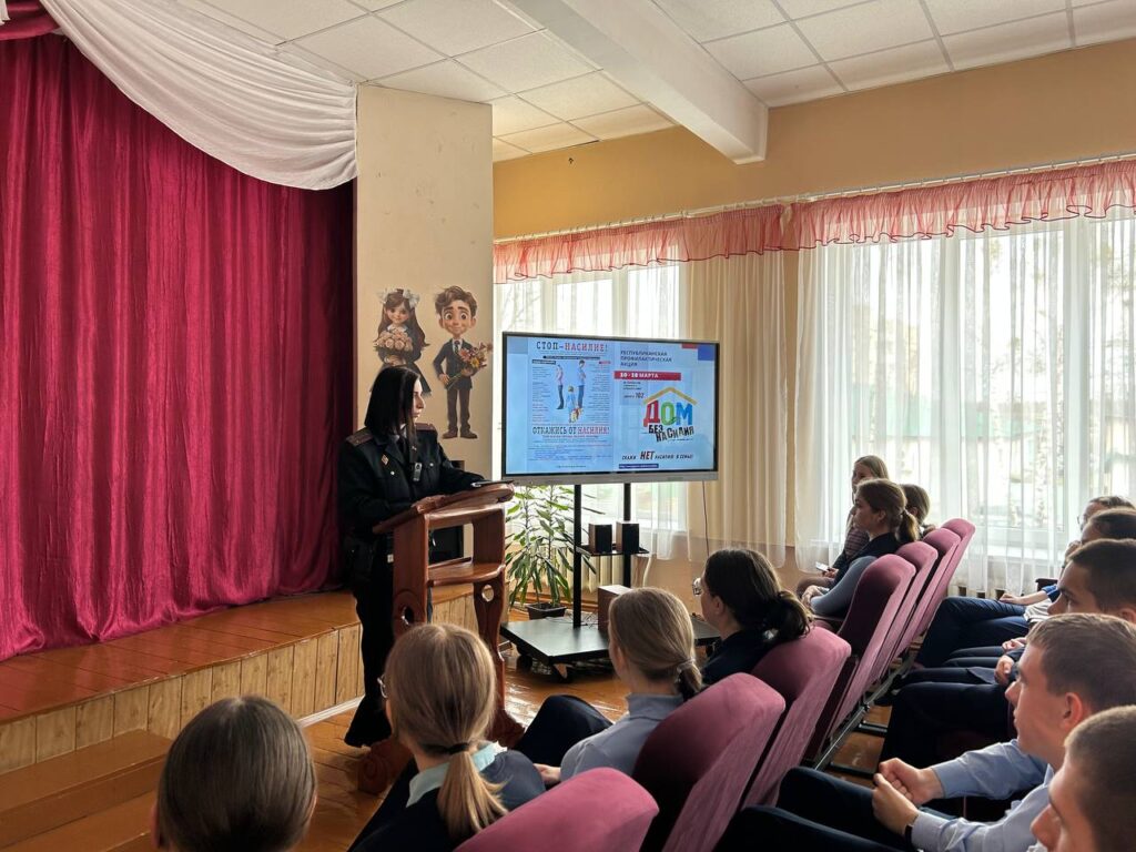 Старший участковый инспектор инспекции по делам несовершеннолетних Октябрьского РОВД Анастасия Кузьменкова провела профилактическое мероприятие с учащимися 8-11-х классов средней школы №2 г. п. Октябрьский на тему «Дом без насилия».