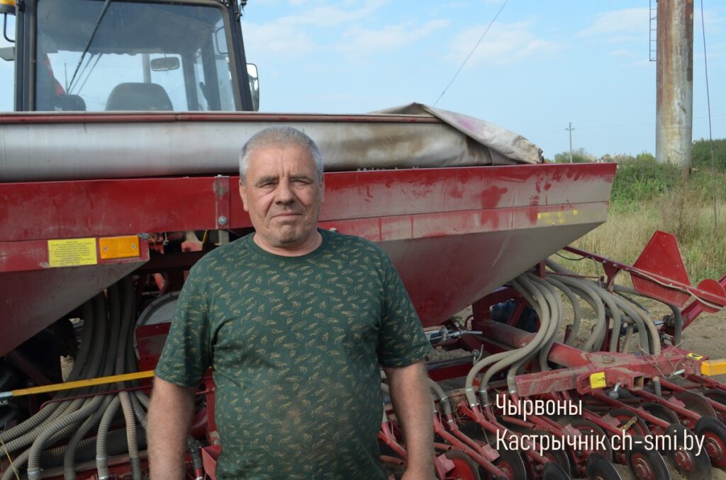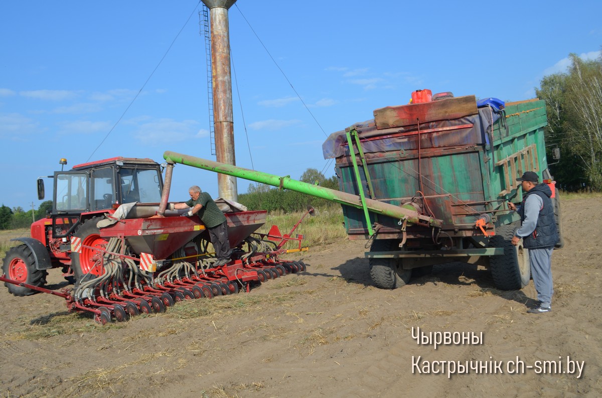 Заключительным аккордом стало 30-гектарное поле в урочище Огороды за деревней Пружинищи, где произвели вспашку после убранного рапса, внесли удобрения, подготовили, как следует, почву. Последнюю работу выполнял механизатор Агаси Мазманян на энергонасыщенном тракторе «Беларус-3522» с культиватором КШП-10. Буквально след в след за ним выводил посевной агрегат опытнейший сеятель этого хозяйства Сергей Манецкий. В целях оперативности заполнение бункеров сеялки осуществляется механизированным путем с помощью загрузчика, оборудованного на базе тракторного прицепа ПСТ-9, с одновременным внесением жидкого протравителя в семена. Этим оперативно и добросовестно занимается механизатор Максим Нуманов, и задержек с загрузкой посевного агрегата у него не бывает.