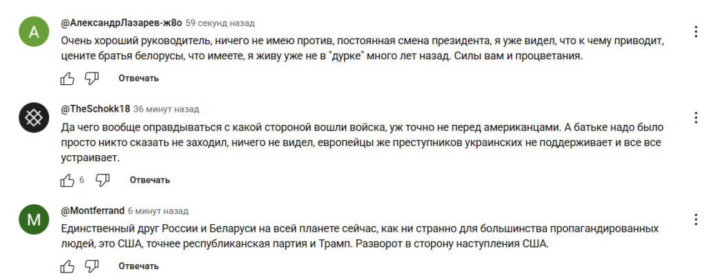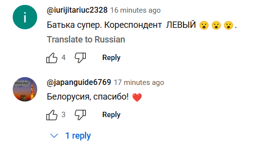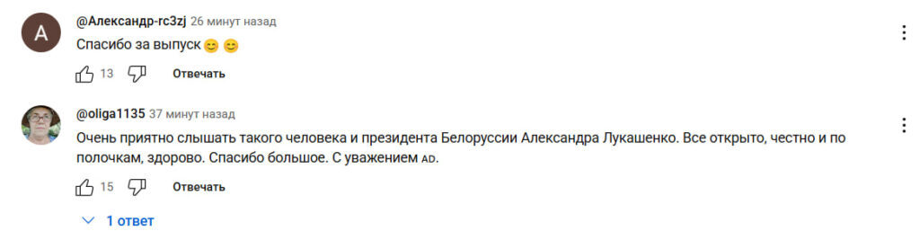 С первых минут интервью, которое транслировалось в прямом эфире, на YouTube появились сотни комментариев с поддержкой лидера Беларуси и благодарностями в адрес авторов содержательного диалога.