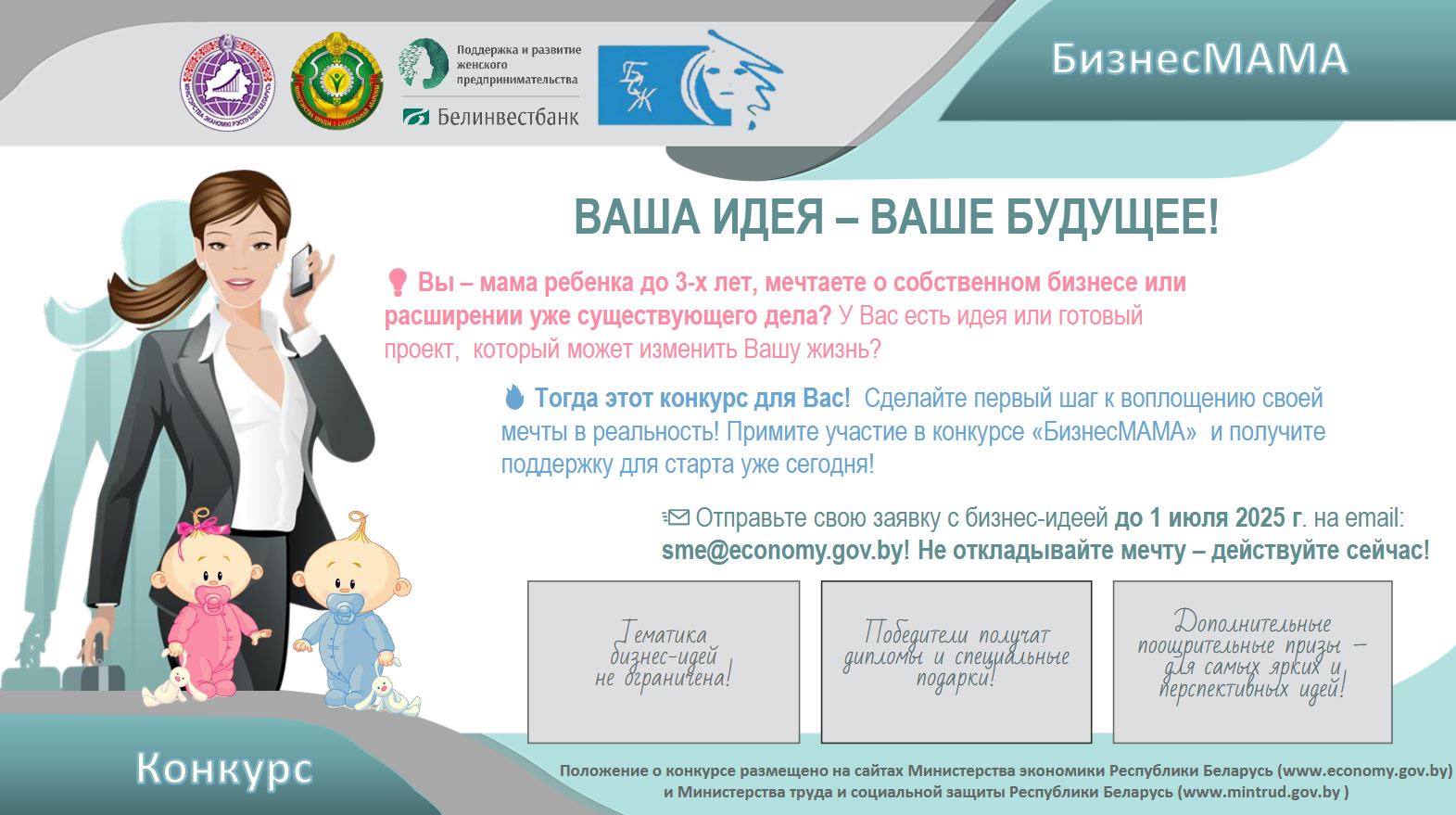 Министерство экономики совместно с Белорусским союзом женщин и ОАО «Белинвестбанк» при поддержке Министерства труда и социальной защиты проводят конкурс «Бизнес МАМА» на лучшую бизнес-идею, бизнес-проект.