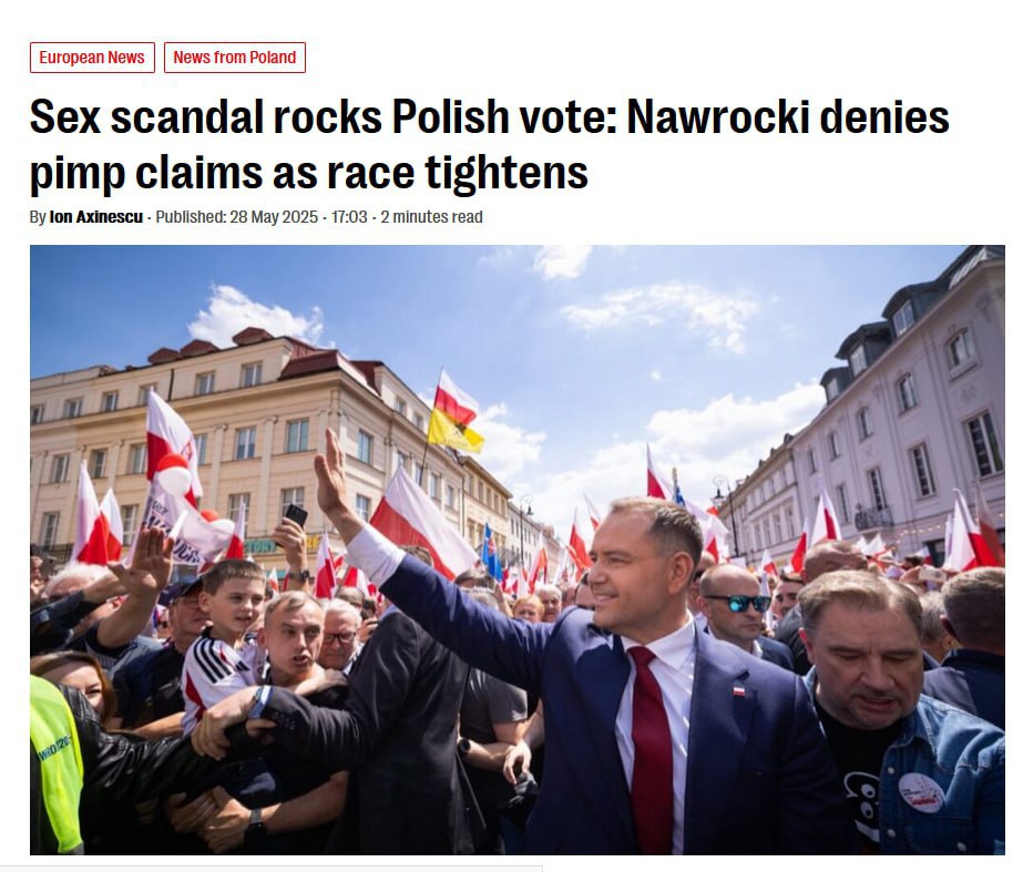 Кандидат от партии «PiS» Кароль Навроцкий оказался в центре секс-скандала. Польское издание Onet утверждает, что политик был сутенером. Сам Навроцкий отрицает это.