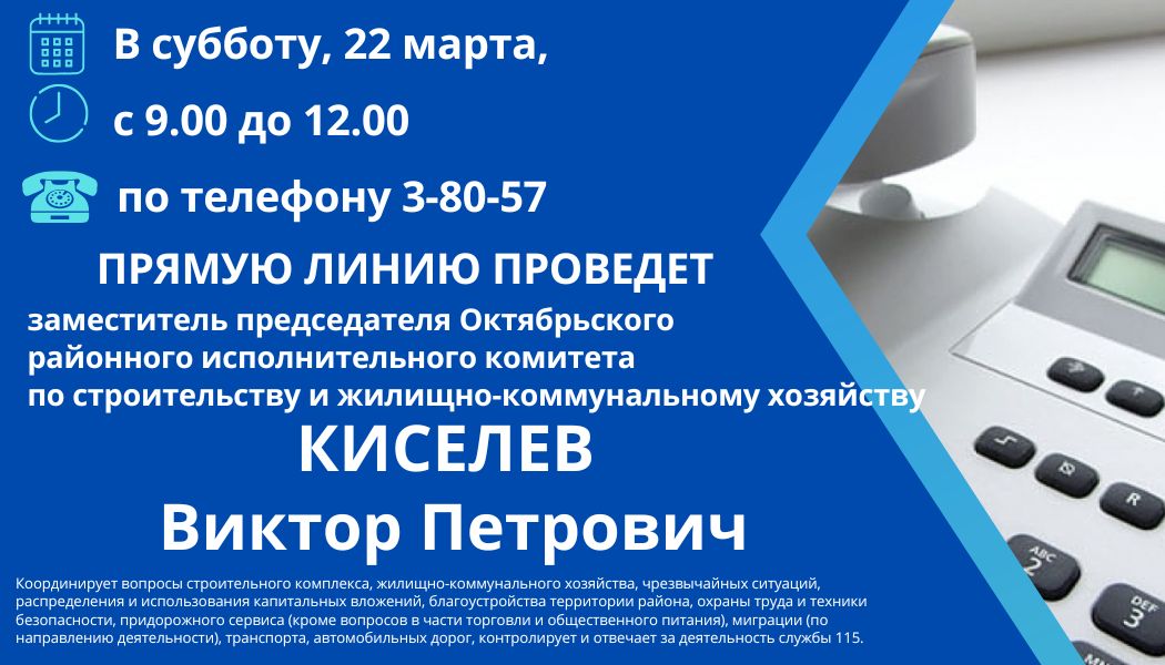 Заместитель председателя Октябрьского райисполкома Виктор Киселев проведет прямую линию Прямая линия 21 Мар 2025 560